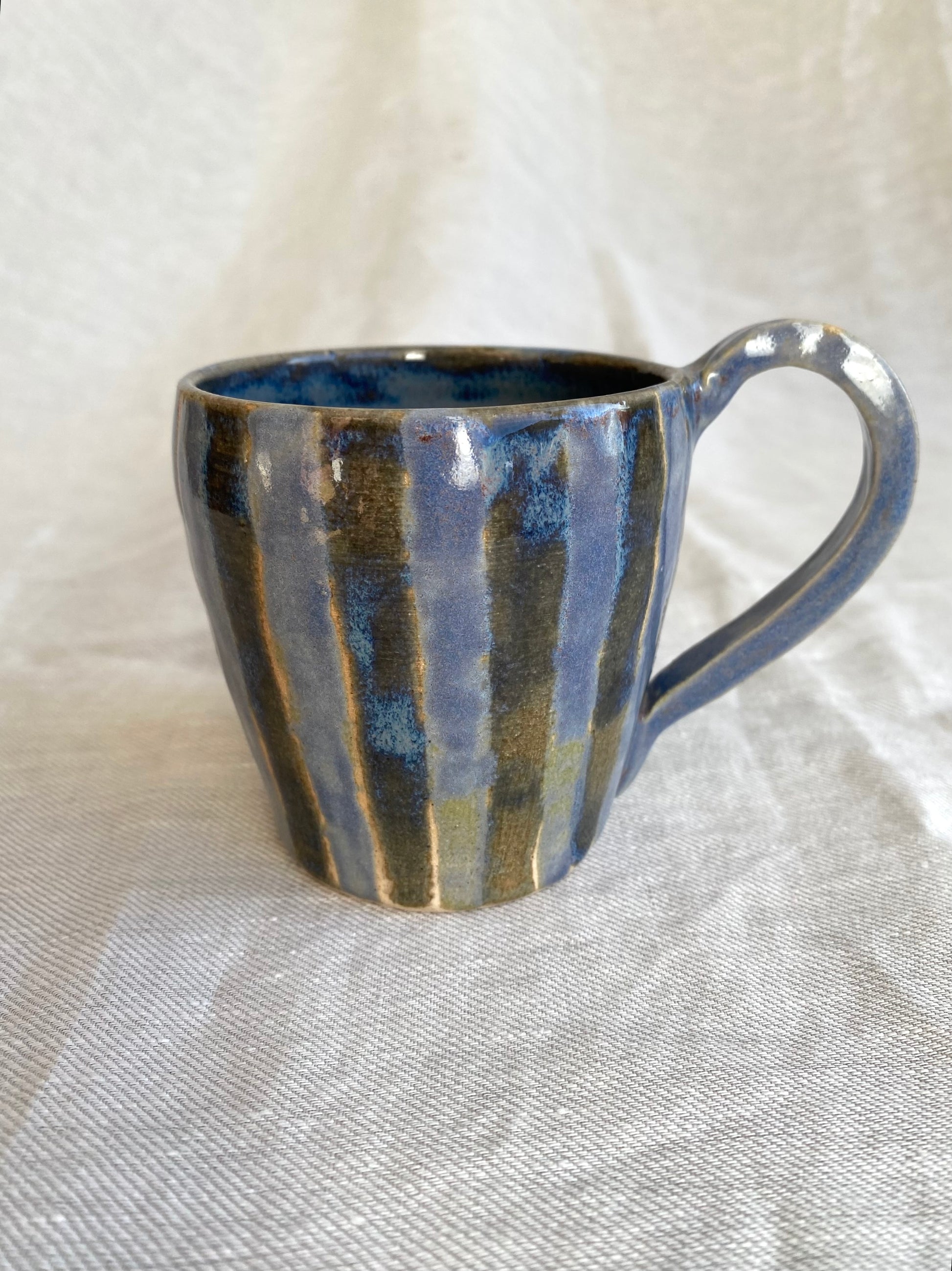 stoneware coffee cup with bright blues and a black and blue glaze Angel design