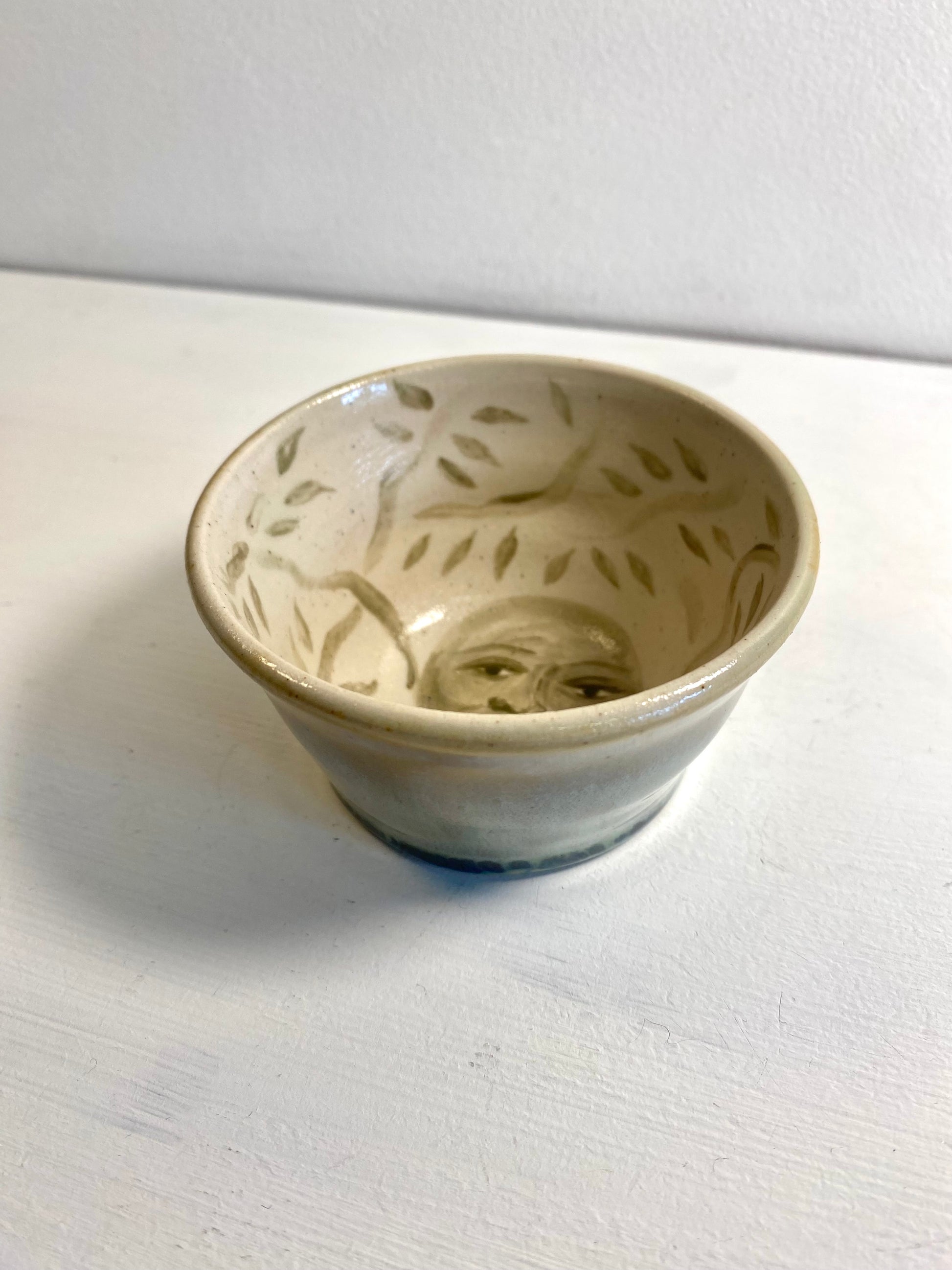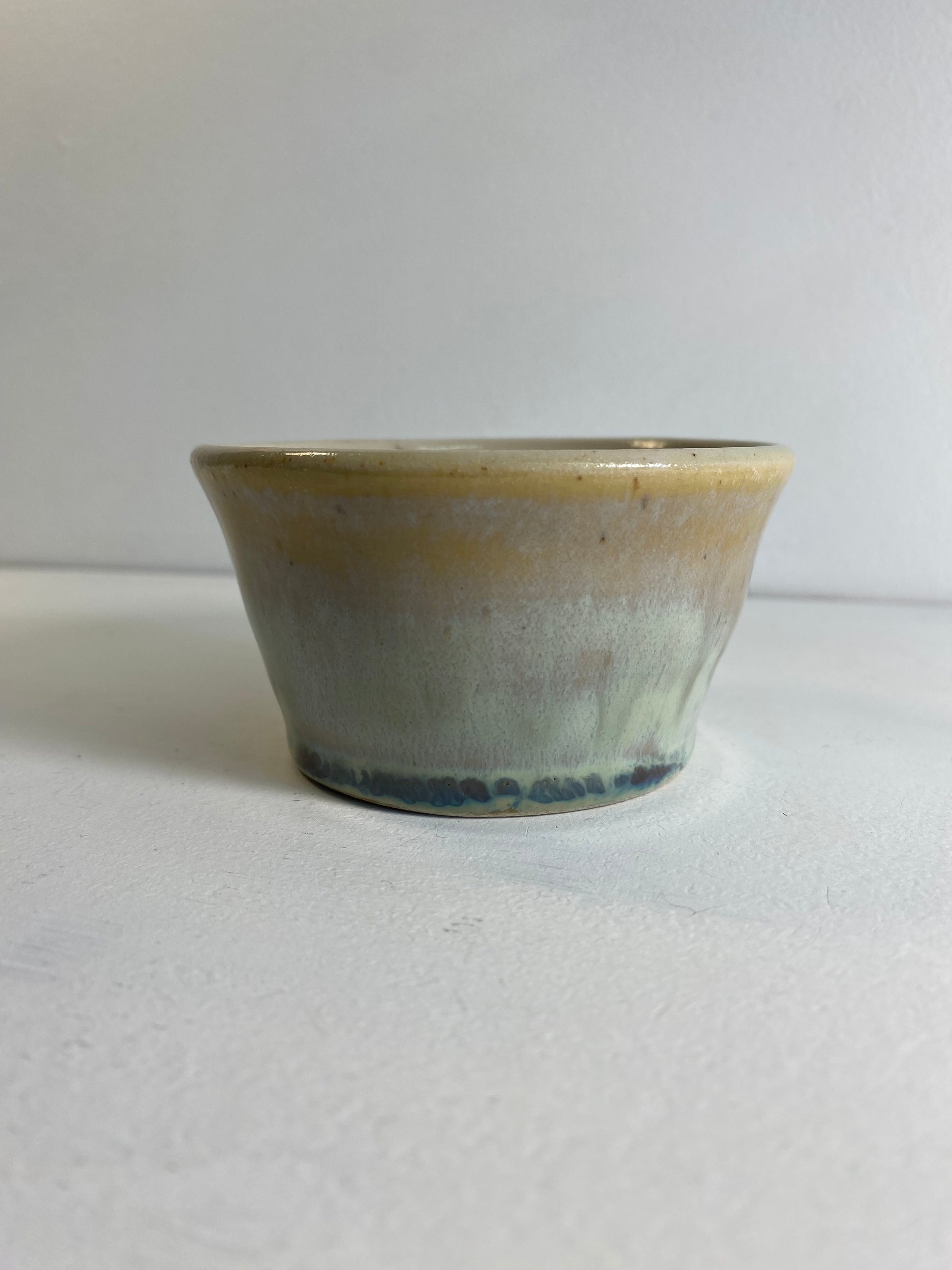 handmade and handpainted trinket bowl with gold and blue tone glaze exterior